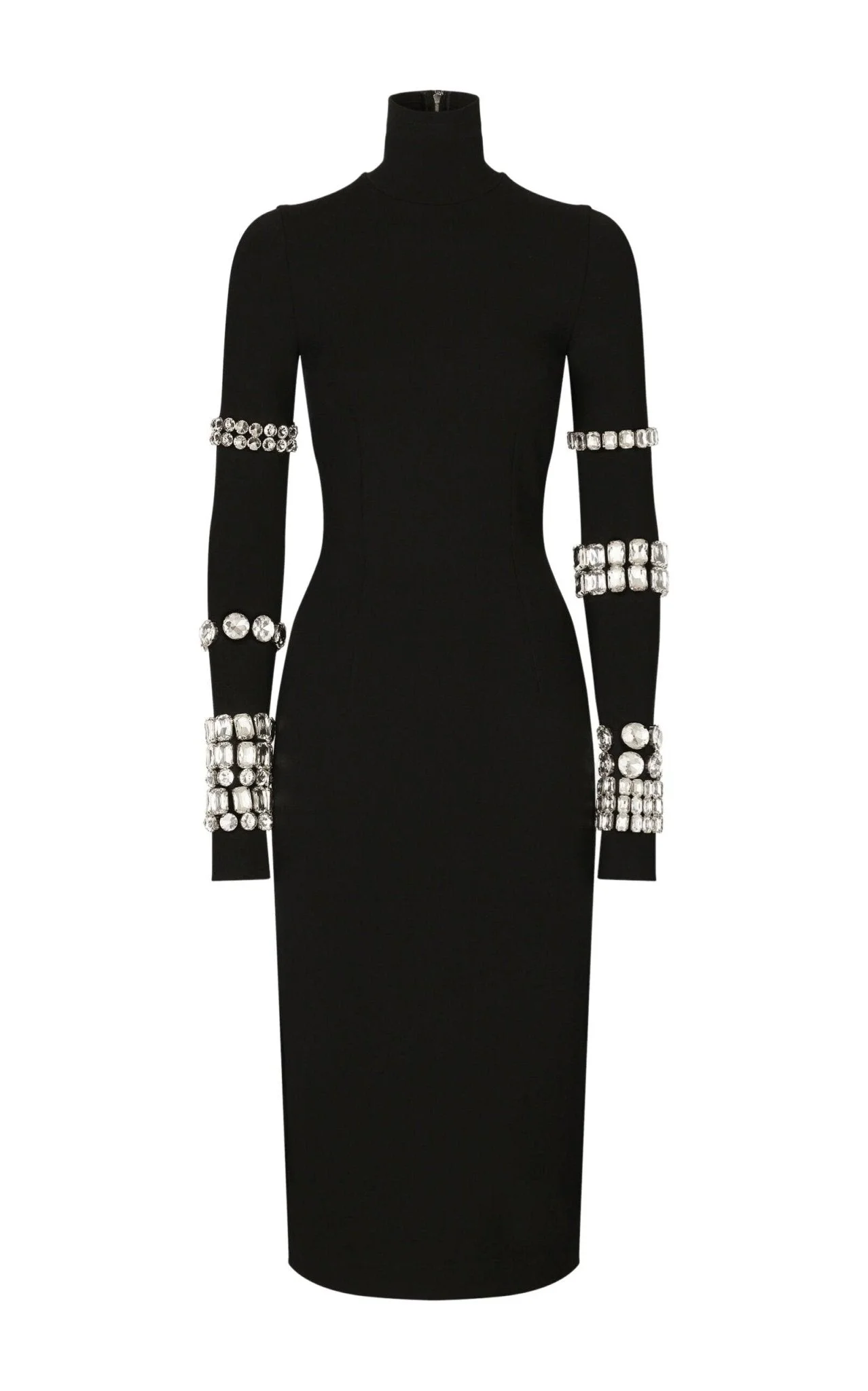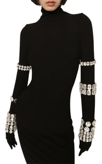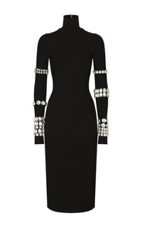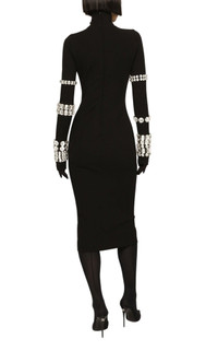 From the Dolce & Gabbana x Kim Kardashian collaboration, this embellished stretch-knit midi dress reinterprets a classic silhouette through a bold, modern lens. Crafted in Italy from a sculpting stretch-knit, the design contours the body while maintaining structure and comfort. Defined by a high turtleneck and elongated sleeves, the dress is elevated with crystal-studded bracelet embellishments layered along the arms for a couture-inspired effect. A straight hem and concealed back zip closure complete the streamlined profile, delivering statement evening styling with unmistakable collaboration appeal. Details & Fit Stretch-knit midi dress Dolce & Gabbana x Kim Kardashian collaboration High turtleneck Long sleeves with crystal bracelet embellishments Straight hem Concealed back zip closure Color: Black Made in Italy Fabric & Composition 75% viscose, 17% polyamide, 8% elastane Embroidery: 30% brass, 70% glass Size & Measurements Runs small Pit to pit: 18 in Waist: 27 in (approx. +1 in stretch) Hips: 36 in (approx. +1 in stretch) Length: 44 in (shoulder to hem)