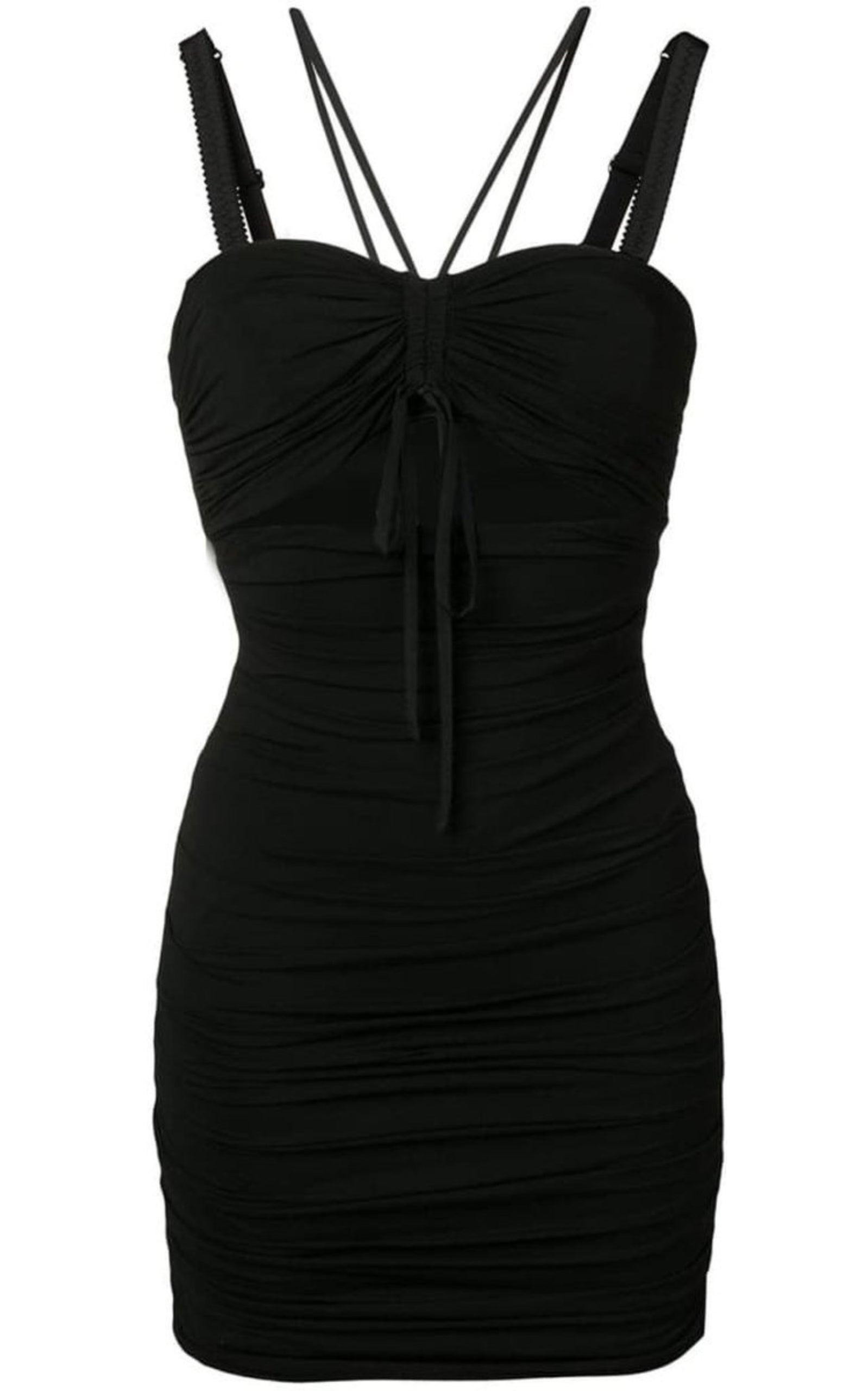 Fitted silhouette Short length Cut out detail to the front with a drawstring fastening Back concealed zip fastening Halter straps with contrasting adjustable shoulder straps. Designer Style No. F6E3BT FUGD4. Self: 74% viscose, 13% silk, 7% acetate, 6% elastan. Lining: 95% silk 5% elastan. Made in Italy.