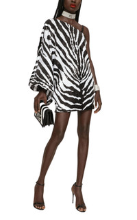 Short sequined one-shoulder dress with zebra print