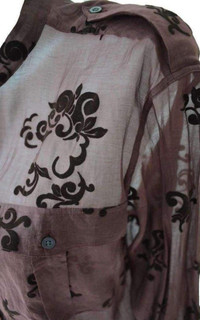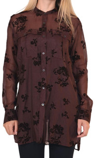 Burgundy sheer floral motif shirt. Long sleeves. Boxy fit Spread collar Two fron pockets. Button closure at front. 55% Cotton, 43% Silk, 2% Polyester Dry clean. Made in Hungary.