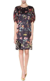 Dries Van Noten's navy printed dress is flawlessly executed with just the right amount of modernity. The sleek texture and simple silhouette are given a twist with voluminous, shorter-length sleeves.. Snap fastening at the nape of the neck 100% Viscose Style Name: Devona Bis 6550 Dry Clean Made in Italy