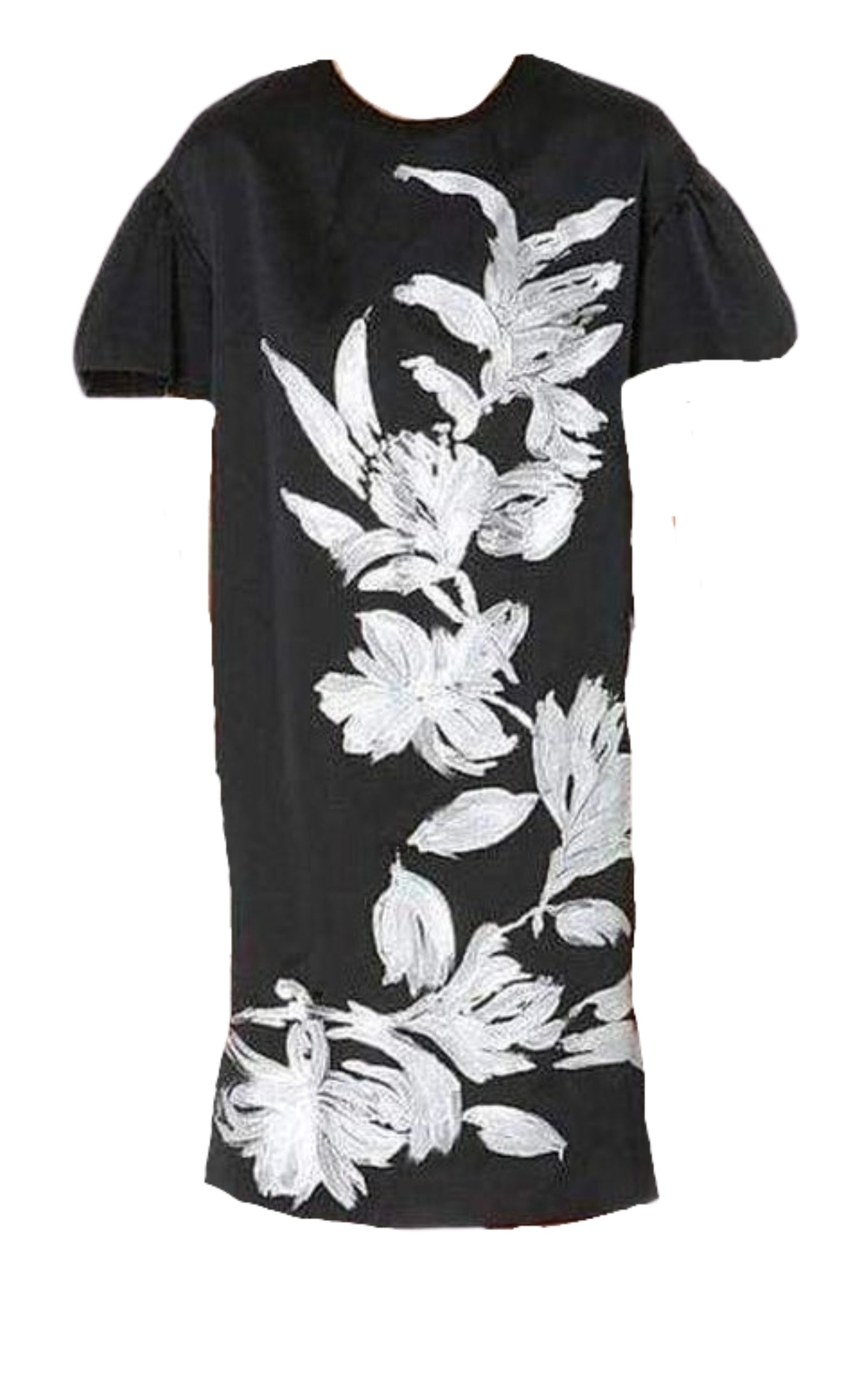 Round neck Short length sleeves Hand painted floral motif in silver at front Back zipper closure Full lined 40% silk, 40% polyester True to size Dry Clean Made in Belgium