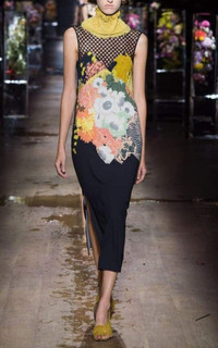 Crepe dress Exposed button and concealed zip fastening at back Round neck Sleeveless Semi-sheer netted panel at front and back yoke Floral print Split at front hem Partially lined 98% viscose, 2% elastane Dry clean