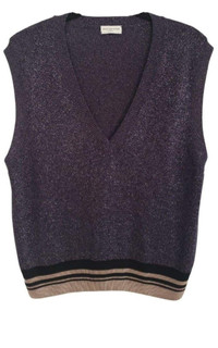 Dries van noten women's silver lurex v-neck waistcoat Lurex V neck with beige stripes knitted Purple Sleeveless Ribbed outlines and black striped bottom 84% viscose, 16% polyester Made in Belgium