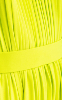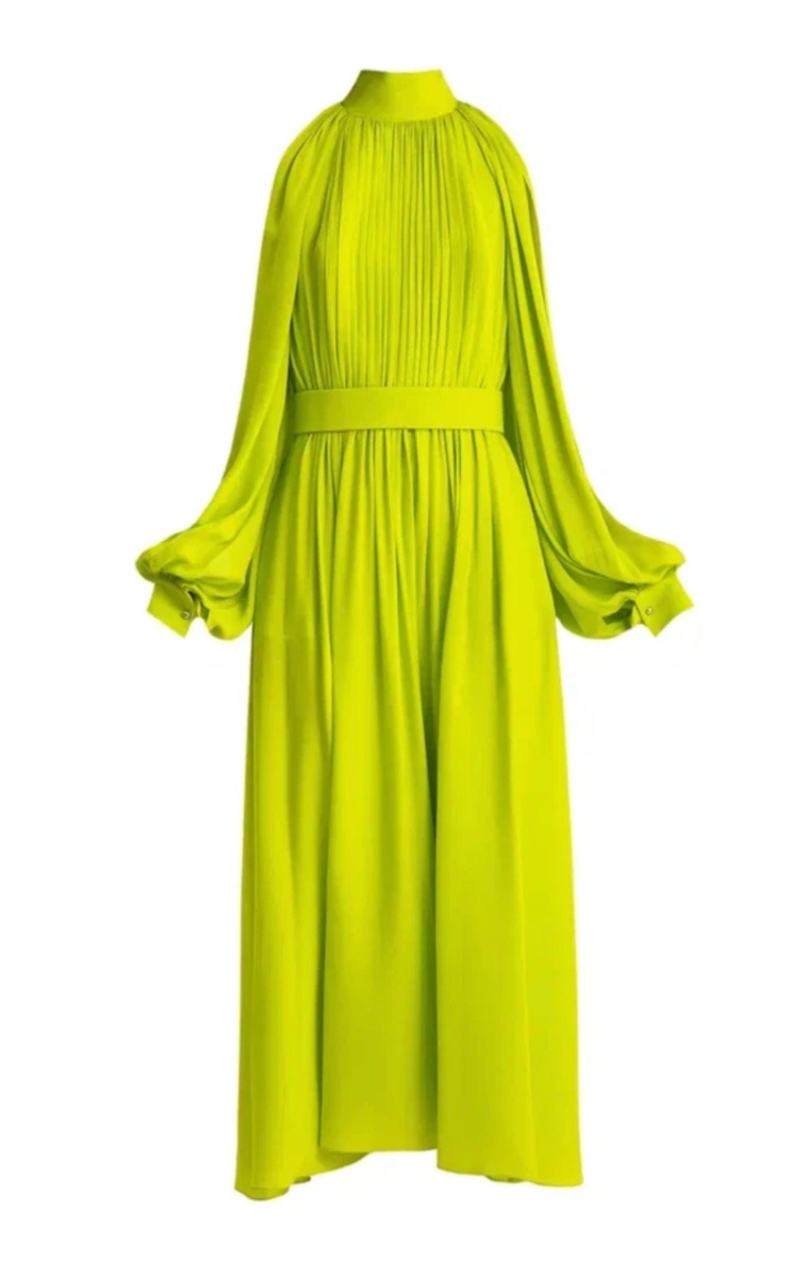 Silk dress in lime shade from Elie Saab. The draped model will shimmer beautifully while walking due to the smoothness of the material. Open sleeves Stand-up collar Ties into a bow at the back Color: neon green Composition: 100% silk