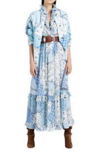 Etro chiffon dress in patchwork pattern with cascading ruffles. High ruffle neckline. Long sleeves; button cuffs. Self-tie belt. A-line silhouette. Tiered ruffle hem. Balloon sleeves Button fastenings through front Composition: 100% silk Dry clean Made in Italy