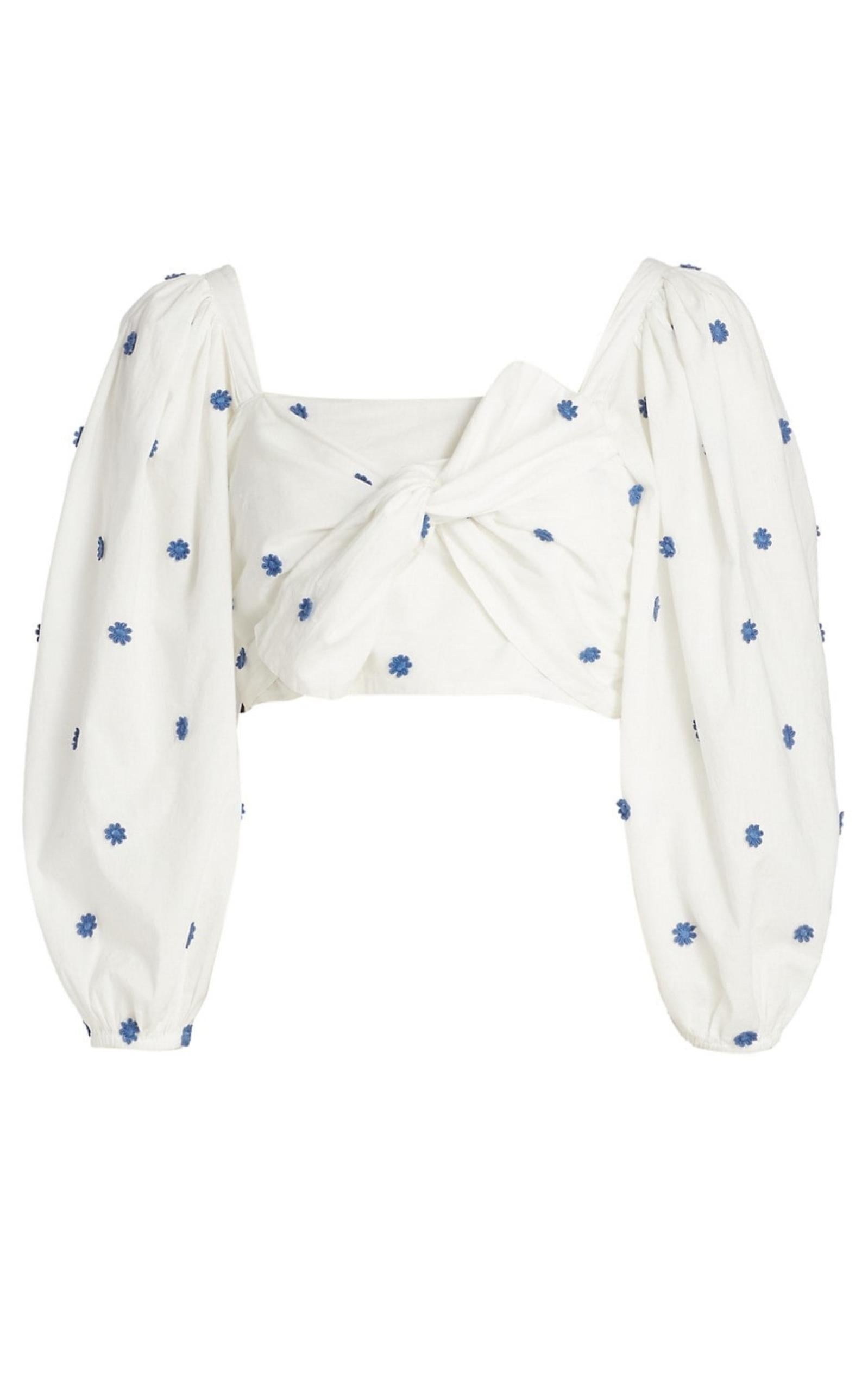 Embroidered with petite flowers, Farm Rio's crop top is styled with an asymmetric front knot and long sleeves. Square neck Three-Quarter Sleeves Concealed side zip Cotton Hand wash Imported