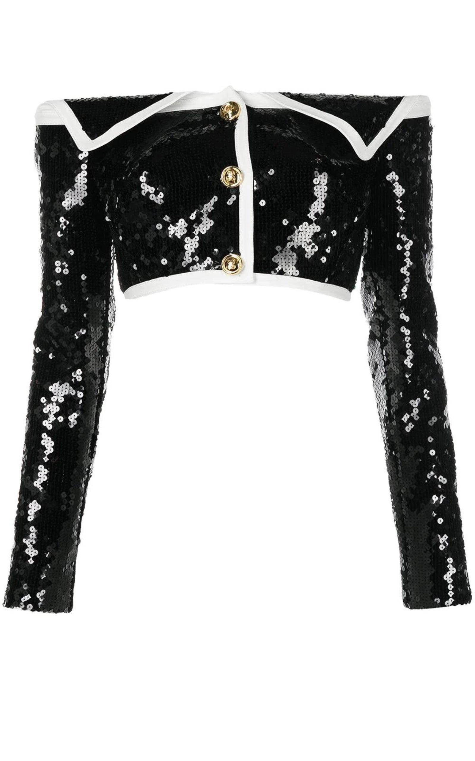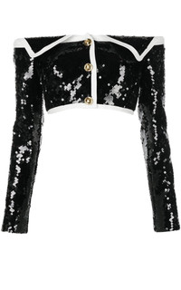 Giambattista Valli sequin-embellished jacket with gold-tone buttons and contrast trim Fitted Gold-tone hardware Sequin design Off-shoulder Front button fastening Long sleeves Cropped length Composition: Polyester 100% Dry Clean Only Made in Italy