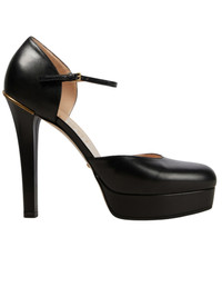 Gucci Black Leather Buckle Pumps - Gold-tone GG bars to the heel counters Block heels Ankle straps. Buckle fastening Almond toe Leather insole and sole Upper: leather Heel: 5'/13cm Platform: 1"/3cm True to size Made in Italy Have Questions about us, read our FAQ