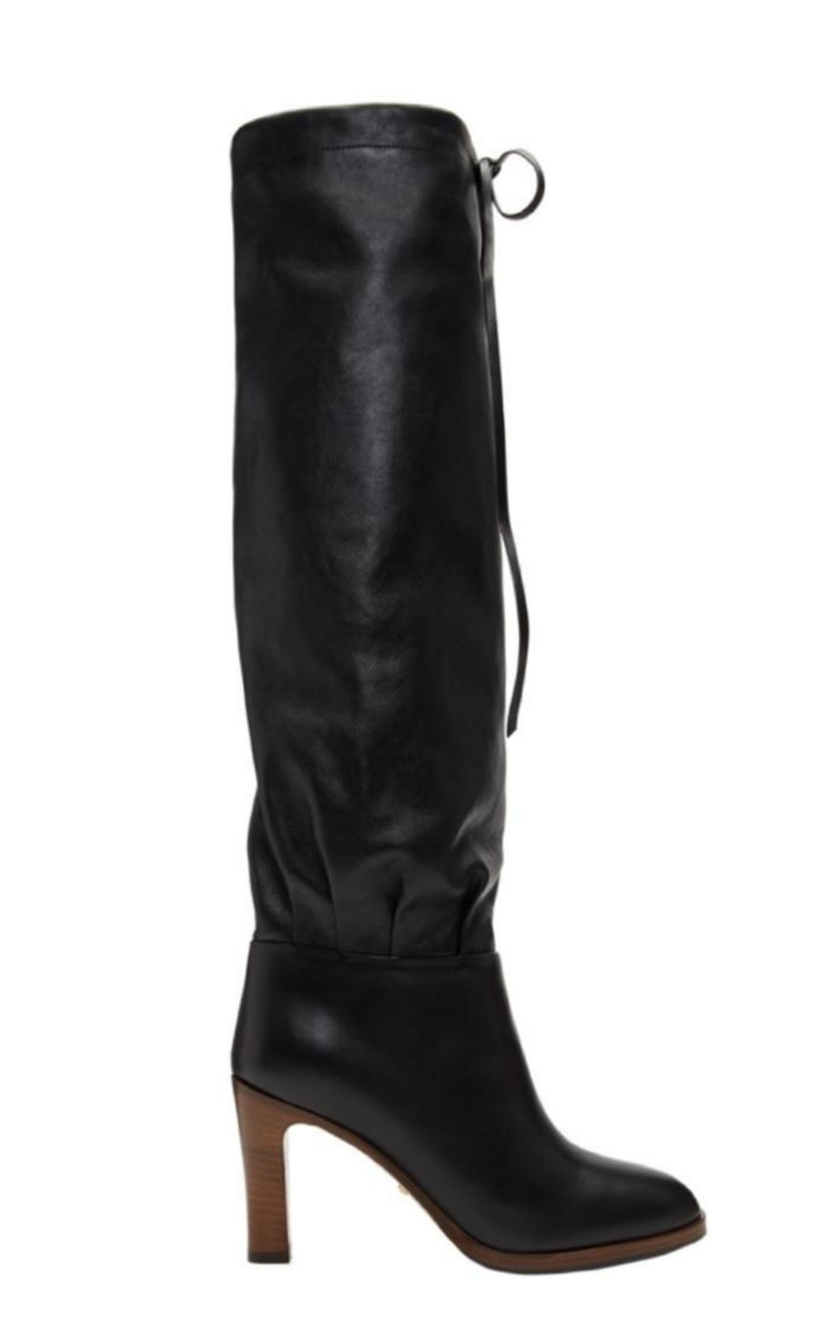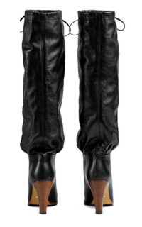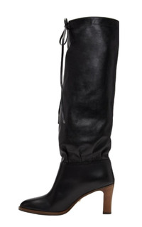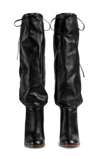 The knee boot is designed with a relaxed leg and cinched self-tie detail at the opening. Crafted from leather noted for its soft, buttery feel. Black leather. Wooden heel. Cinched tie detail. 3.5" heel height. 16.5" shaft height. Composition: Leather 100% Sole: Wood 100% Designer Style ID: 5496800QH00 Made in Italy.