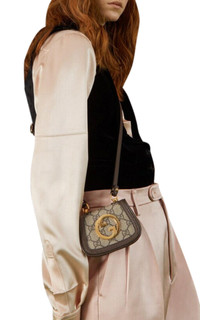Beige and ebony GG Supreme fabric, a material with reduced environmental impact Brown leather finishes Gold-colored finishes Round GG cross Closure with automatic button Height: 3.5"/9cm Width: 4.75"/11,5cm Adjustable shoulder strap, height (light) 17.5"/44 cm Composition: GG Supreme’ Canvas, Calf Leather Inner Layer: Fabric Other elements: Metal Made in Italy