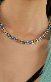 A marina chain necklace in sterling silver features colorful enamel flowers. Inspired by the botanical world, such symbols continue to imbue House collections with a romantic feel. The Interlocking G, representing the Founder's initials, appears as part of the clasp closure. 925 sterling silver Marina chain Green, blue and yellow enamel flowers Clasp closure with Interlocking G 38cm length adjustable to 43cm Made in Italy