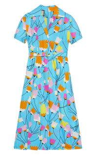 Short sleeve cotton and linen-blend poplin mid-length dress in blue. Multicolor floral pattern printed throughout. Open spread collar. Button closure at front. Belt loops, detachable belt with pin-buckle fastening, and pleats at elasticized waist. Zip closure at back. Tonal hardware. Supplier color: Azure Midi length Composition: 70% cotton, 30% linen. Dry Clean Made in Italy.