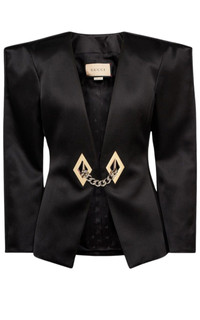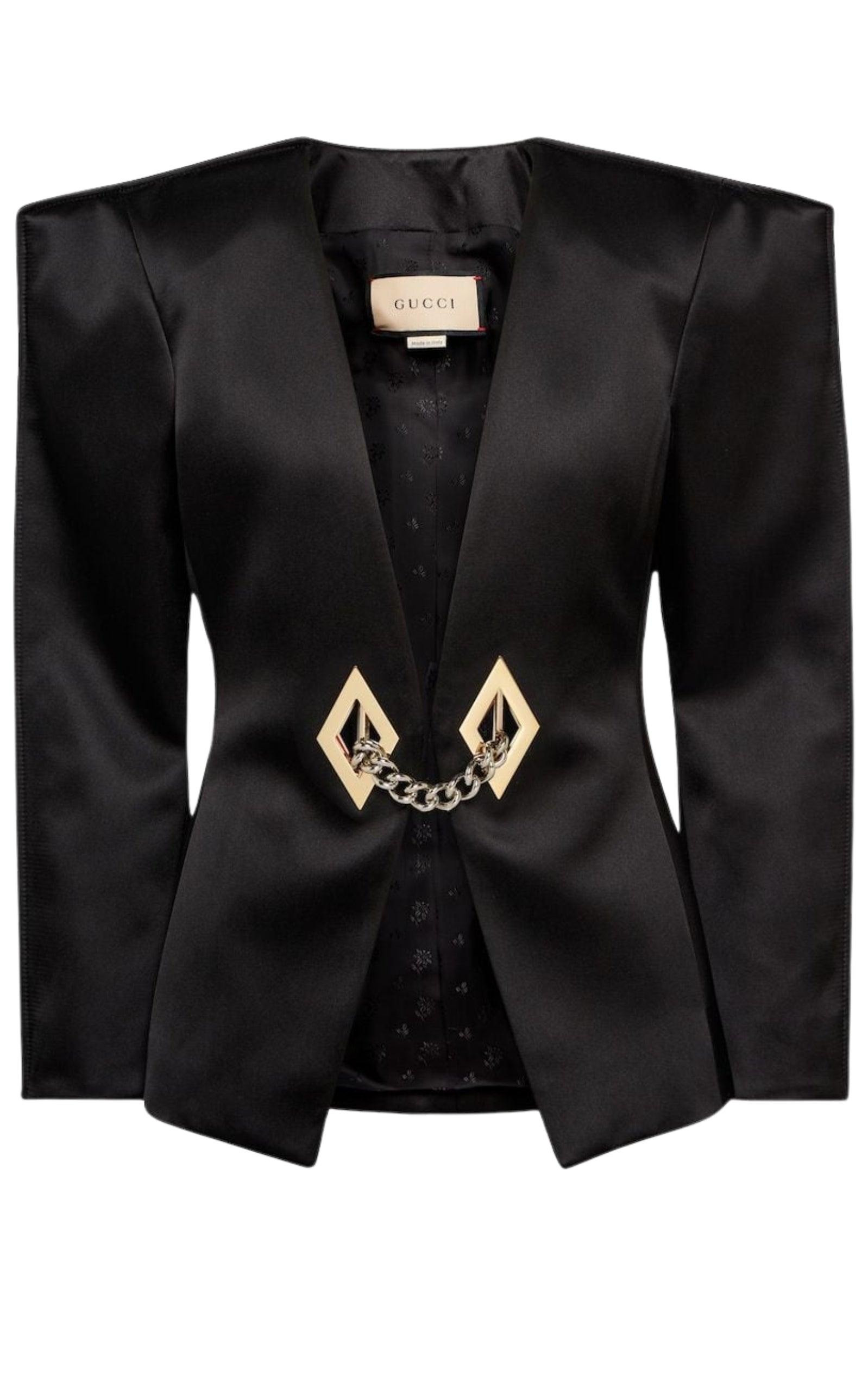 This power-shouldered design is made from shiny silk-backed satin and secures with an eye-catching chain detail that's looped through golden hardware at the front. Tonal and gold-tone hardware. Composition: Cotton 98%, Elastane 2% Lining: Viscose 100% Made in Italy