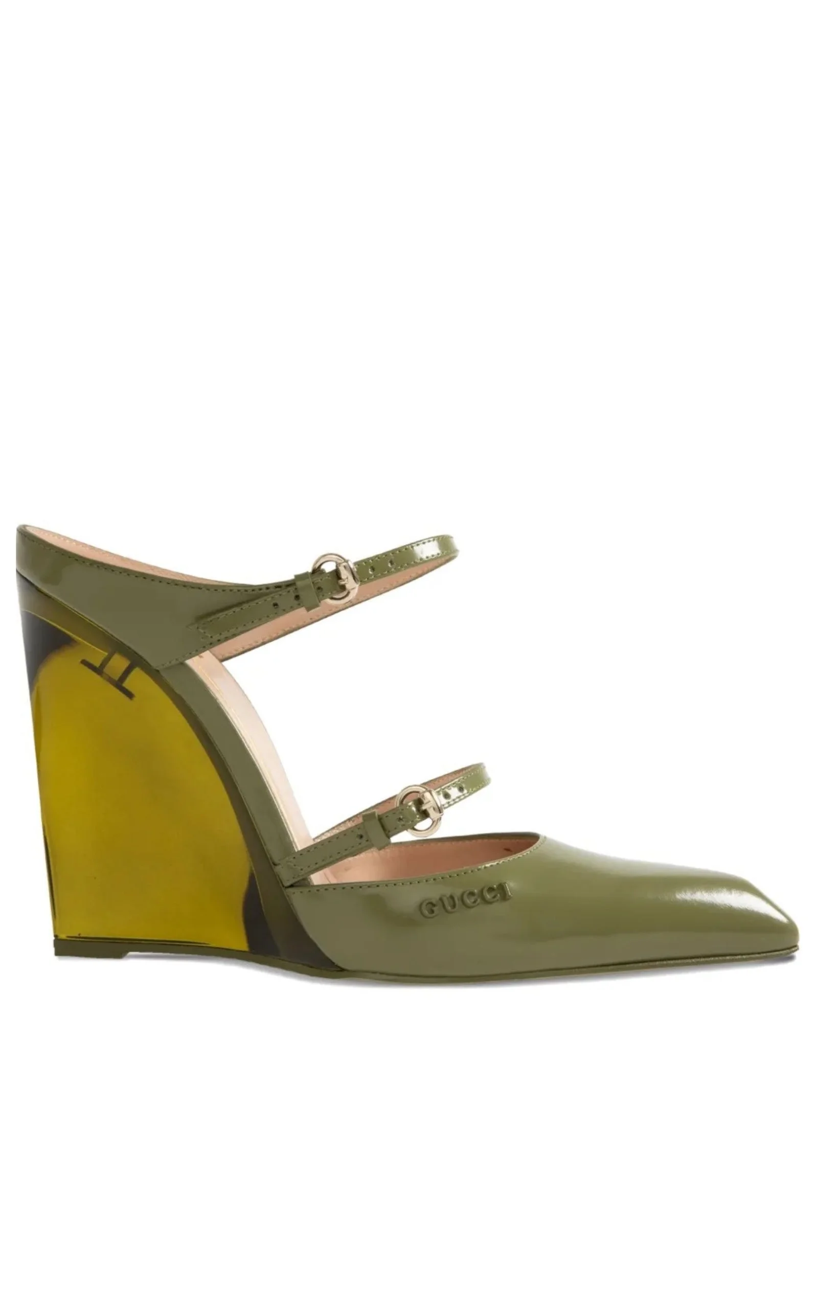 Gucci presents a pair that is pure perfection! The Christy 110 wedge mules are part of the label's Spring Summer 2025 collection, a smooth leather pair that is sanded, brushed, polished by hand, and then varnished with a 5-phase technique, featuring dual leather straps, a pointed toe, and a translucent wedge heel. Buckle fastening Pointed-toe Gold-tone hardware Green Leather Lining: Leather lining Heel height: 11cm Made in: Italy Have Questions about us, read our FAQ