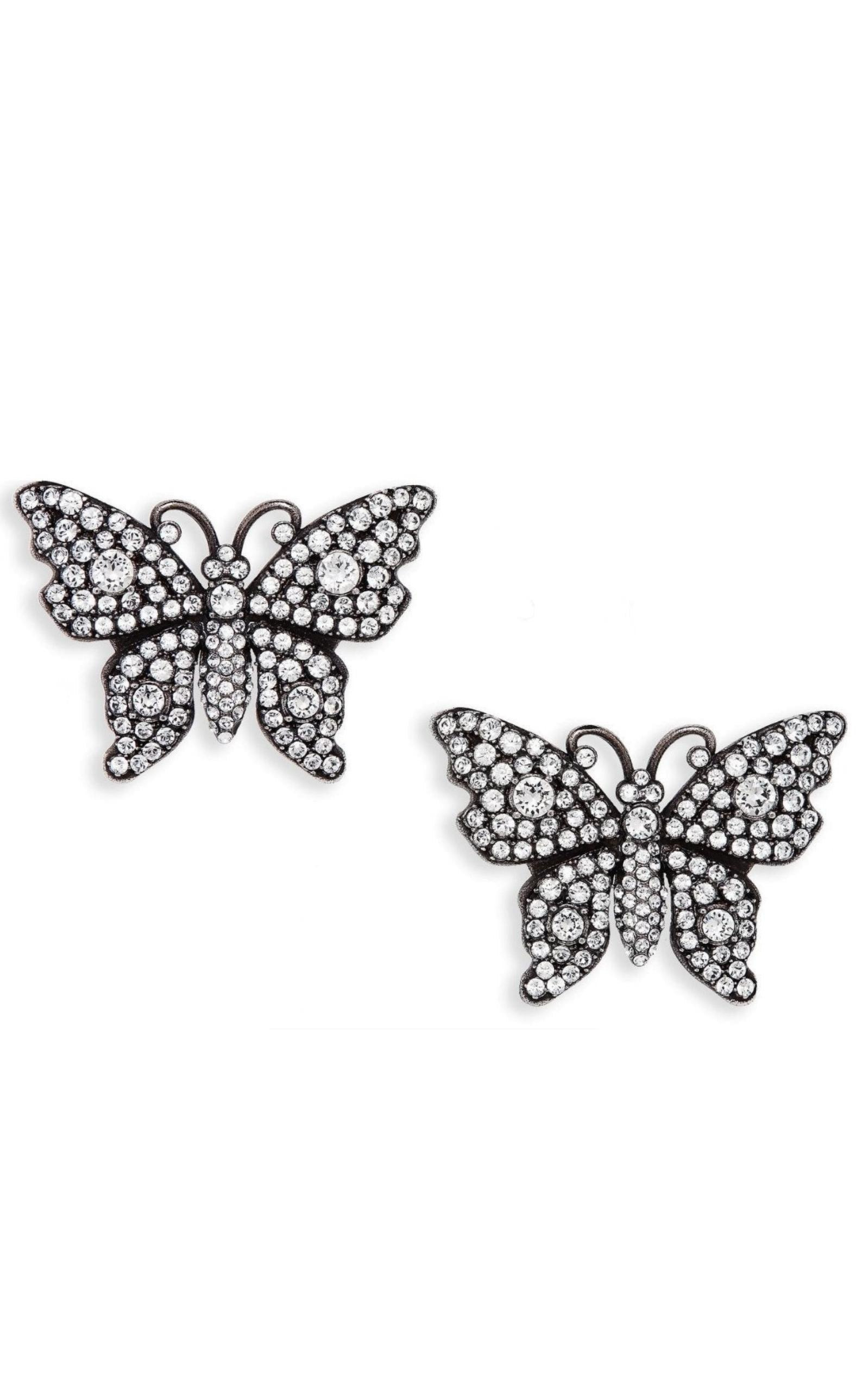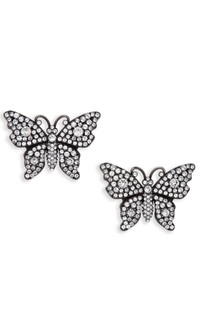A symbolic emblem from the Gucci Garden, the butterfly has become synonymous with the House. The winged motif is interpreted as stud earrings encrusted with sparkling multicolored crystals. Metal with aged gold finish. Multicolored crystal studded butterfly detail; For pierced ears. 1.5" x 1". These earrings come as a pair. Made in Italy.