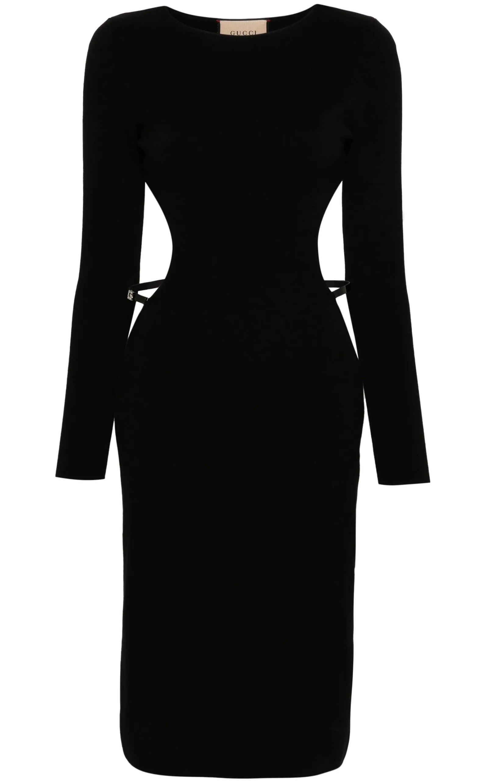 Crystal G Cutout Dress with c rystal-embellished G plaque Cut-out detailing Leather strap detailing Boat neck Long sleeves Slim cut Straight hem Knee-length Composition: Lamb Skin 100%, Cotton 78%, Silk 22% Made in Italy Have Questions about us, read our FAQ