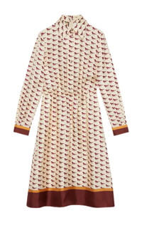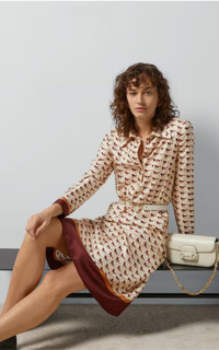Gucci Diagonal Horses Print Silk Dress The Gucci Diagonal Horses Print Silk Dress reimagines the House's iconic equestrian heritage with a bold diagonal horses pattern. Crafted from ivory and red silk, this shirt dress is accented with red and orange trim. Features: Diagonal horses print in ivory and red silk Red and orange trim for a vibrant contrast Self-covered buttons with signature G detail Point collar and long sleeves with buttoned cuffs Elastic waist for a comfortable, flattering fit Rear vent and zip closure for tailored finish Length: 41.3" (based on size 38 IT) Unlined for lightweight wear Made in Italy Why You'll Love It: With its refined equestrian print and tailored shirt dress silhouette, this Gucci design effortlessly combines classic elegance with bold design details. Perfect for elevated daytime wear or evening styling. Authenticity & Condition 100% authentic Brand new, never worn Why Shop at Runway Catalog? At Runway Catalog , we curate authentic designer fashion at exceptional prices—up to 80% off MSRP. Each piece is brand-new, 100% authentic, and selected for its timeless style and luxury craftsmanship. Enjoy peace of mind knowing you are investing in genuine, high-quality fashion. Have Questions? Find answers to common questions in our FAQ section .