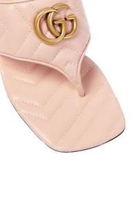 Gucci's classic Marmont line is reimagined in this pair of slip-on sandals. They arrive in padded chevron matelasse leather with the designer's iconic Double G motif on top in gold-toned hardware. The short heel and chunky straps offer premium comfort for all-day wear. Designer color name: Perfect Pink Light pink chevron matelasse leather Mid-heel, 2"/5.5 cm heel height Composition: 100% Leather Lining Composition: 100% Leather Sole Composition: 100% Leather Made in Italy