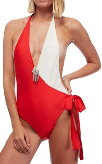 The embellished swimsuit from Gucci features a halter-neck design and a removable crystal embellishment. V Neckline Halter style with self-ties Dropped neckline Tie detail on the side High-Cut Leg 80% Polyamide 20% Elastane 100% Glass Trim Hand Wash Made in Italy.