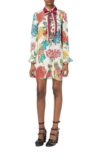 Web detail on collar and neck ribbon Ruffle detail along the front placket with white trim Bell sleeves with white trim GG pearl and chain buttons Unlined Composition: 100% silk Exterior Composition 40%; cotton 60% viscose Made in Italy
