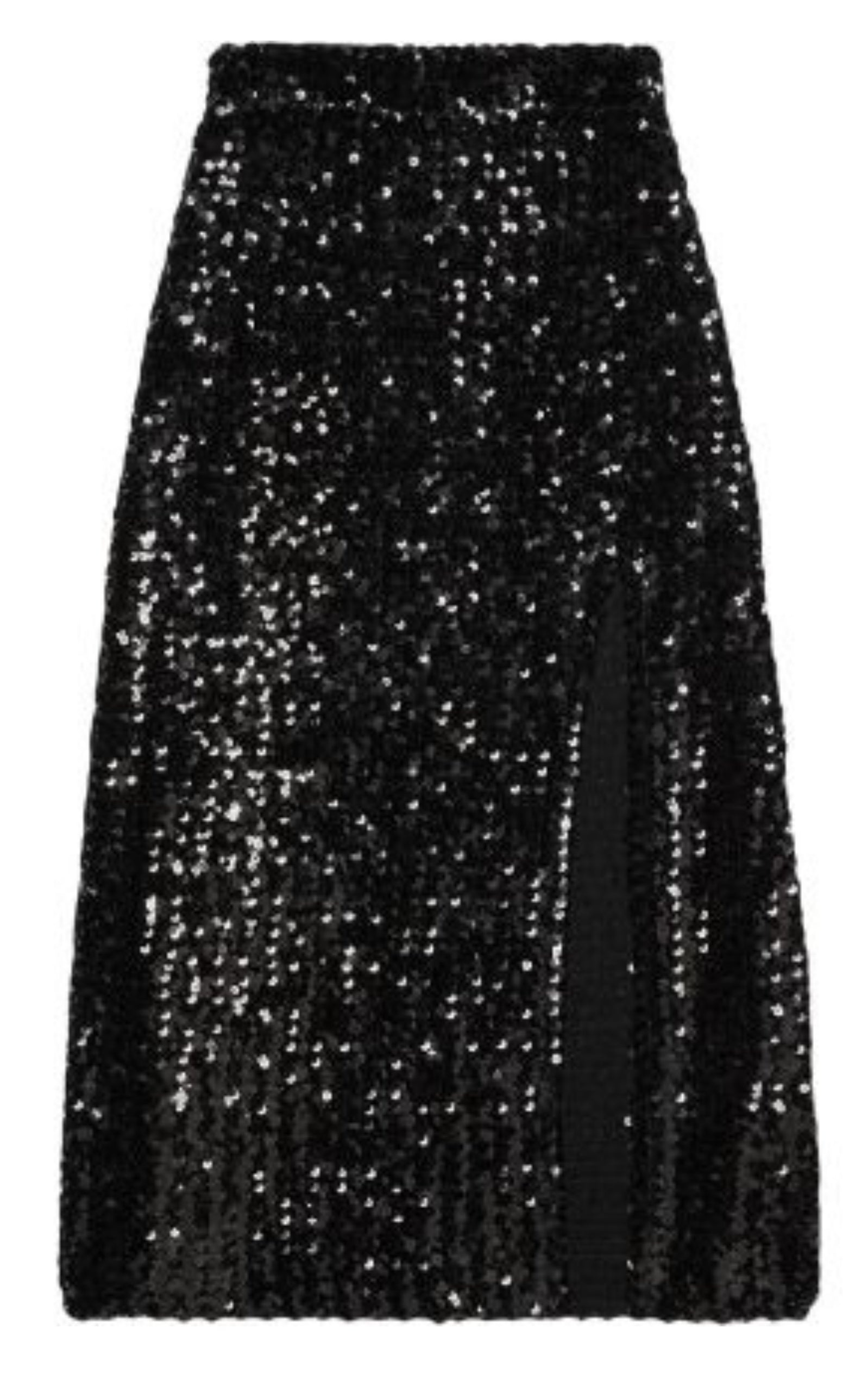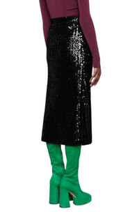 Detailed with a front slit, this black skirt from Gucci is decorated with all-over sequin embroidery for an extra sparkly touch. All-over embroidered black sequins Front left slitt High waist Side zip fastening Mid-length. Please note, the slit is designed to be easily altered to a lower length or closed as desired. Composition: 67% Acrylic, 29% cotton, 4% Polyester Made in Italy