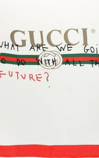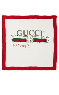 The ironic and witty handwritten aphorisms appear over the Gucci vintage logo and bring together Coco Capitán's offbeat sense of humor with the eclectic House aesthetic. This silk scarf is printed with the phrase "What are we going to do with all this future?" Gucci silk scarf with vintage logo. Approx. 35.5" square (90cm). Hand-finished ends. Made in Italy.