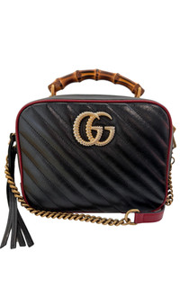 GG Marmont leather small shoulder bag Quilted leather Bamboo detailing Leather and chain-link shoulder strap Single top handle Top zip fastening GG motif Gold-tone hardware Composition: Bamboo 100%, Leather 100%, Gold Plated Metal 100% Lining: Microfibre 100% Depth: 3.7", Height: 6.9", Strap: 21.7", Width: 8.7" Handle: 1.4" Made in Italy