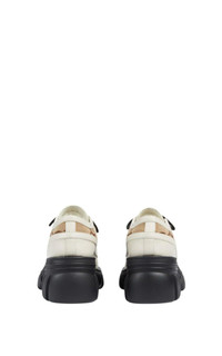 This pair of women's lace-up shoes is presented in a refined mix of white leather and monogram canvas. A lug sole White leather Camel and ebony GG canvas trim Rubber sole Lace-up closure Block heel: 1.5" Platphorme: 1" Made in Italy