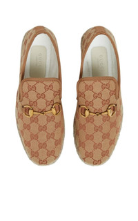 Canvas loafers in beige featuring jacquard logo pattern in brown throughout. Round toe. Signature horsebit hardware at vamp. Grosgrain binding in brown at tongue and collar. Terrycloth lining and covered midsole in beige. Tonal treaded rubber outsole. Antiqued gold-tone hardw Composition: Canvas 100% Sole: Rubber 100% Lining: Fabric 100% Height: 2 " Made in Italy
