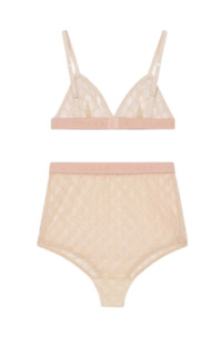 Embroidered logo detail throughout. Bra adjustable shoulder straps Rear hook and eye fastening Elastic waistband with logo webbing detail. High waist Color: High lights pink Cotton-blend Tulle construction Scalloped trim. Self: 83% polyamide, 17% elastan Embroidery: 90% cotton, 10% poly. Made in Italy.