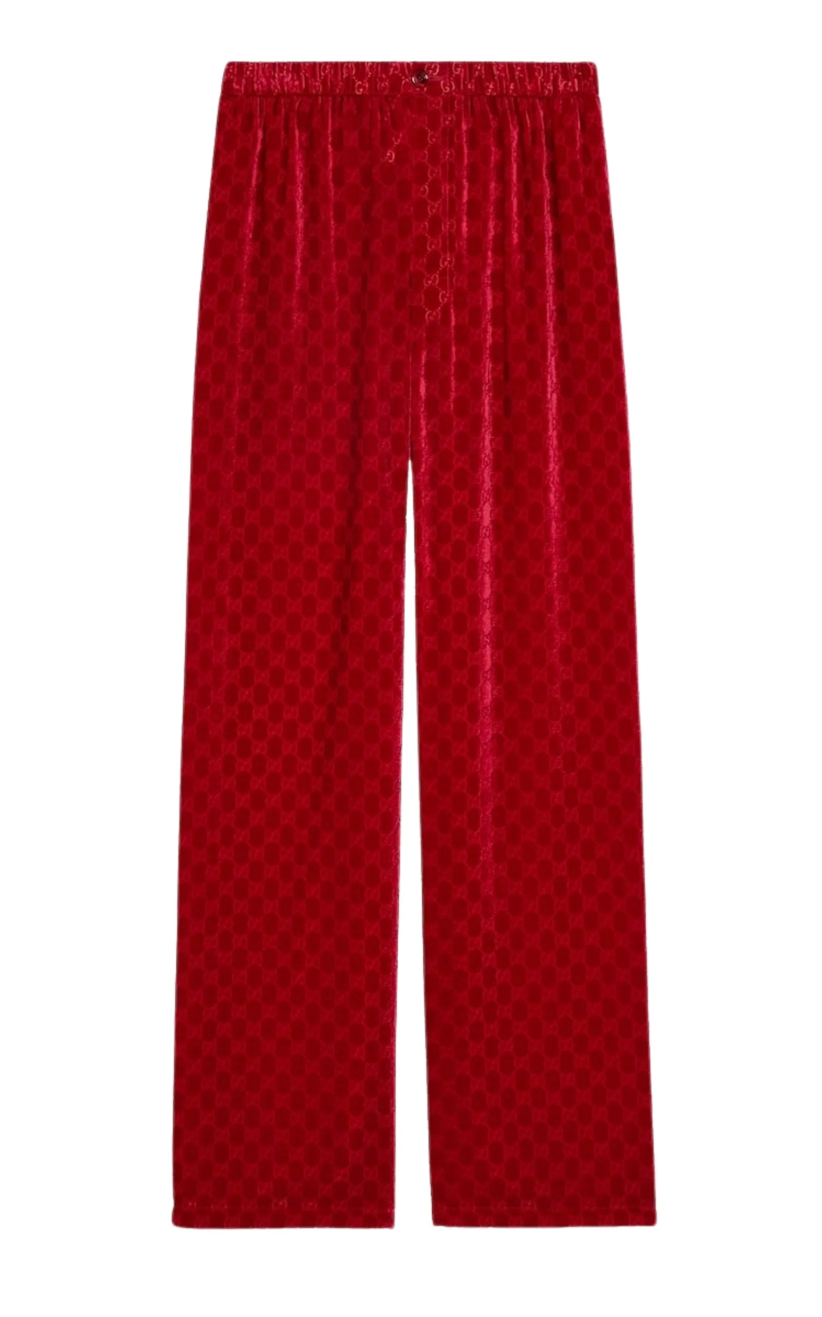 Made of GG devore red velvet, this Trousers feature an expressive texture and a rich shade. The elastic waistband provides comfort while the side pockets add practicality. They are easy to combine with both elegant tops and voluminous sweaters in the cold season. Material: Corduroy Red velvet by GG devore Fabric-covered button with G detail Elastic waistband Pockets: side slit pockets Button closure Material: 78% viscose, 22% silk Lining: 75% acetate, 25% silk Dry clean Made in Italy