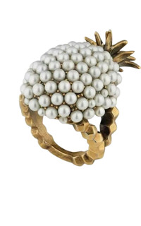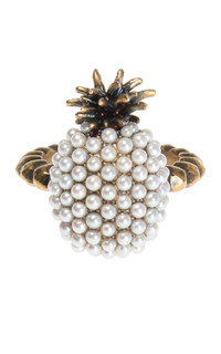 The Gucci Pearl Pineapple Ring in Gold is crafted in Italy from an aged, gold-tone metal and shining resin pearls. This pineapple shaped ring features a faux pearl encrusted pineapple, a geometric textured band, and Gucci logo engraving. Antiqued gold-tone metal Resin pearls Faux pearl encrusted pineapple Textured band Gucci logo engraved on band Composition: Metal, pearle Color: gold Made in Italy