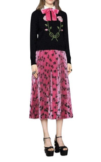 Iridescent pink and black bow lurex. Pleated skirt. Below the knee length. Unlined. 57% polyester and 43% silk. Designer Style I D: 436174ZJM86 Made in Italy