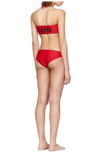 Technical jersey bikini in red. Bandeau top featuring self-tie halter straps. Text embroidered in black at back. Bikini-style bottoms. Fully lined. Tonal stitching. Colour: red Made in Italy