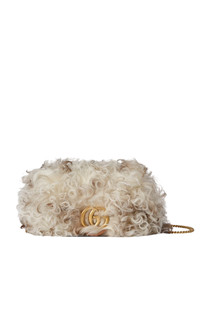 This recognizable Gucci Marmont Super Mini Shearling Bag in White. White and dark brown shearling, Light brown leather trim, Gold-toned hardware, Attached key ring that can attach to a separate bag, Double G, Chain shoulder strap with 23.6" drop Weight: 12.4 oz approximately Super mini size: 6.5"W x 4"H x 2"D Fits up to iPhone Pro, card case, and lipstick Made in Italy Have Questions about us, read our FAQ