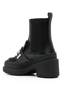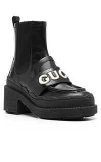 Emblazoned with Gucci's script logo and shaped with a lug sole and scalloped trims, these black leather Ornella boots express a youthful Scallop rubber panel Moc stitching Embossed logo to the front Elasticated side panels Pull-tab at the heel Branded leather insole Front platform sole 60mm mid heel Pull-on style Composition: Calf Leather 100%, Rubber 100%, Lining: Calf Leather 100% Sole: Rubber 100% Made in Italy