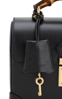 Crafted from leather and bamboo, this black small Padlock shoulder bag from Gucci will instantly open up when it sees you. Featuring chain and leather straps, a round top handle, a foldover top with clasp closure, a curved structure, a suede lining, an internal logo patch and stitching details. Bamboo carry handle at top. Detachable and adjustable curb chain shoulder strap featuring leather strap pad and lanyard clasp fastening. Sheathed keys on detachable leather lanyard at strap base. Foldover flap featuring logo-engraved press-release fastening at main compartment. Leather logo applique at interior. Details: 100% Calf Leather Made in Italy