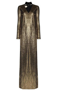 This gold tone Gucci patent choker chain mail gown is crafted in Italy and features a crêpe lining. Cut for a slim, floor-length silhouette V-neck with a detachable black choker Long sleeves Cut out detail Rear central vent Invisible rear zip Chainmail-style construction Composition Polyamide 93%, Elastane 4%, Metallic Fibre 3% Do Not Wash/Do Not Dry Clean Color: gold Made in Italy