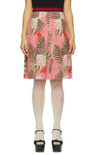 Pleated skirt in coral pink featuring multicolour floral pattern printed throughout. Striped webbing trim at waistband. Concealed zip closure at back. Unlined. Tonal stitching. Colour: pink Material: Silk Made in Italy