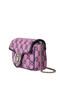 This GG Marmont super mini bag is part of the GG collection Pink diagonal matelassé GG canvas Black leather trim Silver-toned hardware Attached key ring that can attach to a separate bag Double G Chain shoulder strap with 60cm drop Super mini size: W 6.5"/16.5cm x H 3.8"/9.5cm x D 2"/4.5cm Microfibre lining with a suede-like finish Made in Italy