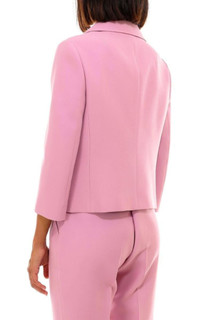 Long sleeve wool cady crepe blazer in pink. Peaked lapel collar. Two-button closure at front. Patch pockets at waist. Darts at front and shoulders. Princess seams at front and back. Textile lining in gold-tone. Fully lined. Tonal and gold-tone hardware. Composition: 54% Silk, 46% Wool Made in Italy