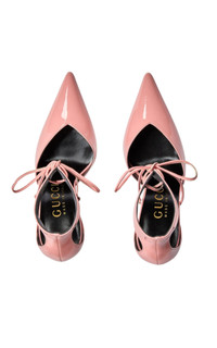 These pointed pumps are made of pink patent leather, inspired by styles from the Gucci house's archives. This pair has a classic charm thanks to the front tie-fastening, pointed toe and contrast high heel. Pointed toe Adjustable ankle strap Gold-tone stiletto heel Leather insole and outsole 4.1"/105mm heel. Made in Italy Outer: Metallic Patent Leather 100% Lining: Leather 100% Sole: Leather 100%
