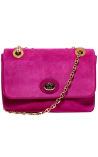 Designed with a very feminine colour, this piece won't let you get unnoticed. Chain link shoulder strap Gold-tone logo plaque Foldover top Internal zip pocket Magnetic closure Main internal compartment Composition: Galf leather 100%, Suede 100%, Metal 100% Lining: Microfibre 100% Colour name: Fuchsia Pink Height: 6.9", Width: 10", Depth: 1,8" Made in Italy