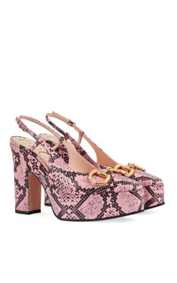 Appearing in "Wild rose"python print leather, these platform pumps have slingback straps and angled square toes. Square Toe Buckle Fastening Ankle Strap Platform height, 1.5" Heel Height: 4.75" Designer color: Wild Rose Upper: Leather Lining: Leather Sole: Leather Made in Italy Have Questions about us, read our FAQ