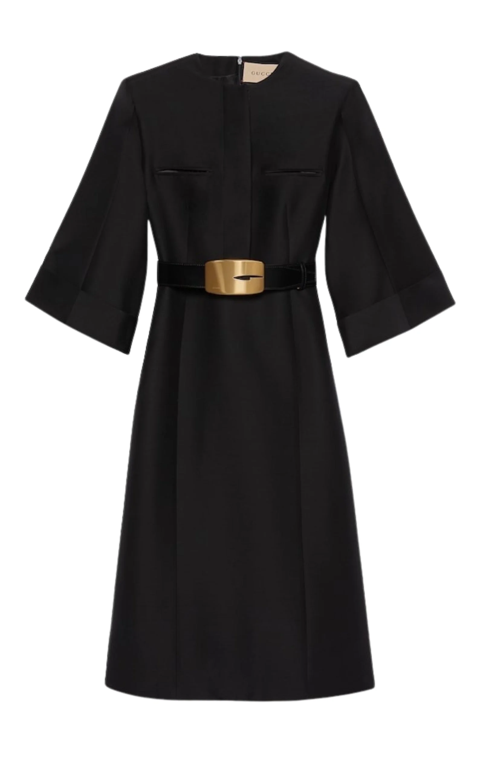This tailored midi dress reveals a sophisticated silhouette with minimalistic details, defined by a contrasting leather belt with G buckle closure. Black soft wool silk Concealed placket with button detail Two concealed front pockets Short flared sleeves with turn-up cuffs Detachable leather belt with bold rectangular G buckle closure Lined Material: wool and silk blend, silk, wool Zip closure Made in Italy Have Questions about us, read our FAQ