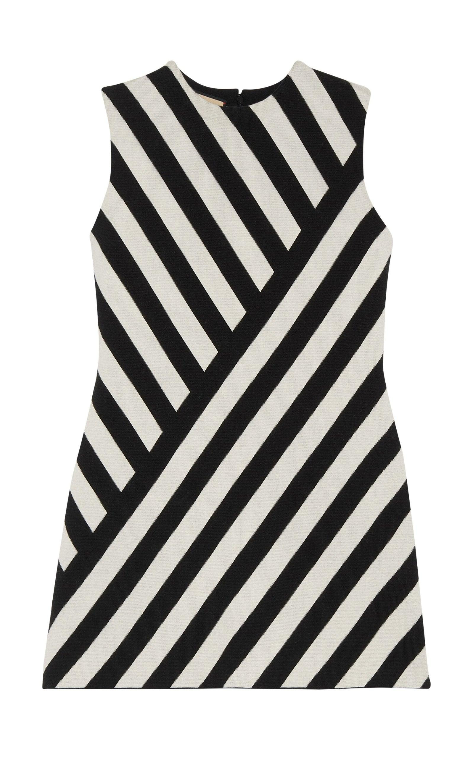 This striking Gucci A-line mini dress is crafted from a wool and cotton jacquard textile with an intersecting stripe pattern. It features a round neckline and a sleeveless silhouette, elevating classic knitwear to create a standout statement piece. This piece fits true to size. We recommend you select your regular size. Designed for a slightly loose fit Made from a mid-weight, slightly stretchy fabric 52% Wool, 48% Cotton Dry Clean