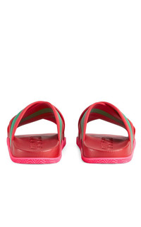 These sandals from Gucci boast the instantly recognizible Web detail and a contrasting pink sole. Green and red Web rubber Open toe Slip-on style Moulded footbed Crisscross straps Embossed Gucci logo Branded insole Composition: Rubber 100% Lining: Rubber 100% Sole: Rubber 100% Made in Italy
