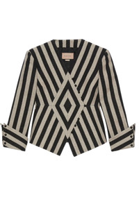Long sleeve wool crepe blazer Peaked lapel collar. Two-button closure at front. Patch pockets at waist. Darts at front and shoulders. Princess seams at front and back. Textile lining in gold-tone. Fully lined. Tonal and gold-tone hardware. Composition: 54% Silk, 46% Wool Made in Italy