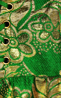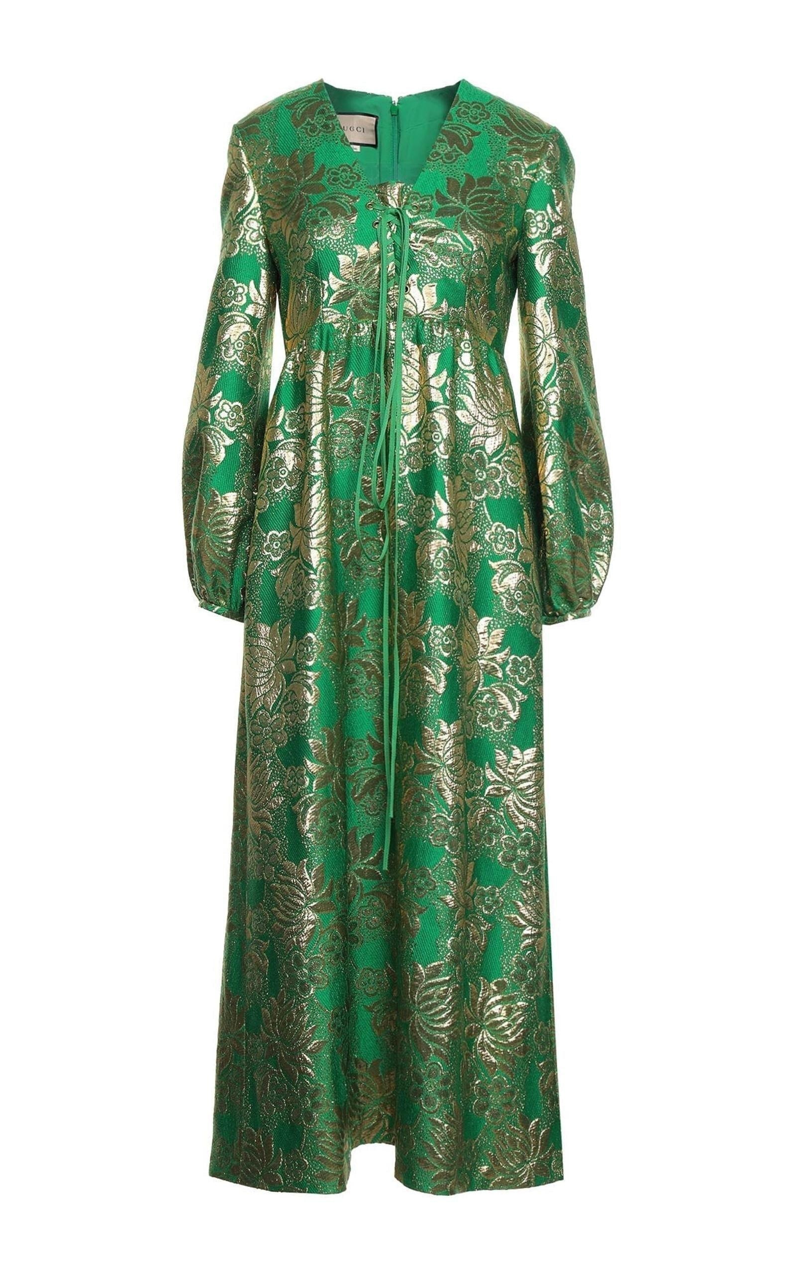 Green and gold floral patterned wool is punctuated by lame detail on this front tie gown. Rich in pattern and decoration Green and gold wool lame floral jacquard Lace detail Due to the printing technique used, the placement of the pattern will vary from item to item Front tie detail Puff sleeves Back zip closure Colour: Green and Gold Composition: 71% wool 15% metallic polyester and 14% polyamide Dry clean Made in Italy
